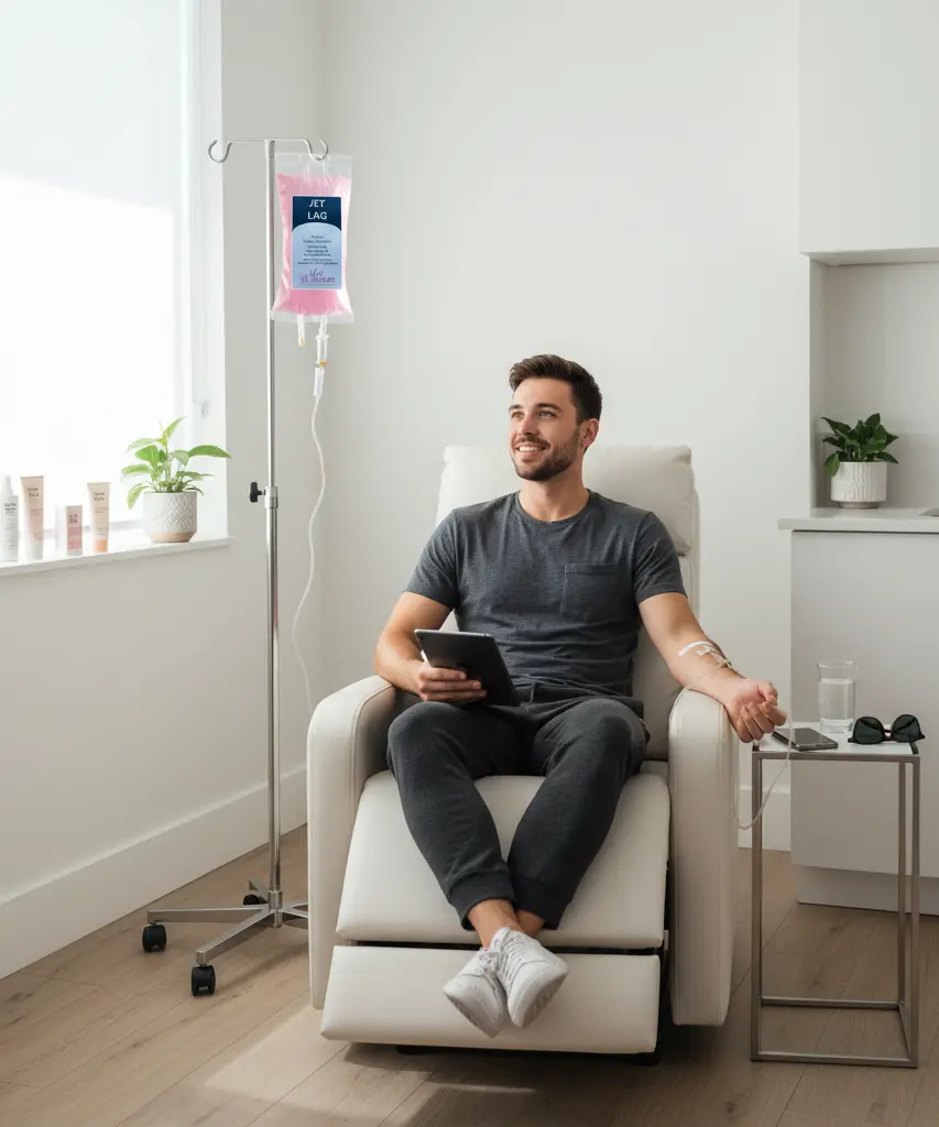 Jet Lag Relief IV Therapy is a targeted infusion designed to combat fatigue, dehydration, and sluggishness caused by crossing multiple time zones